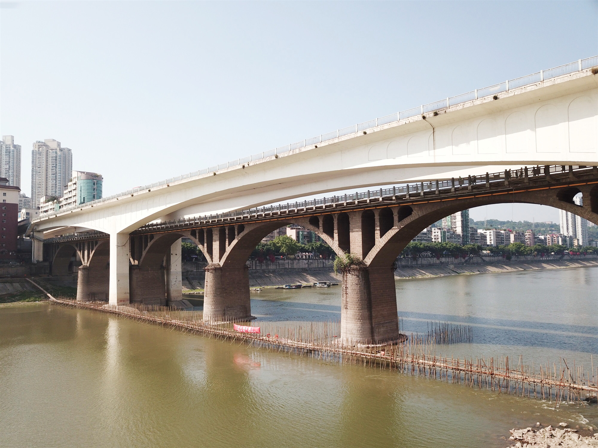 據(jù)悉,沱江一橋是連接主城區(qū)(江陽區(qū)與龍馬潭區(qū))沱江兩岸的交通核心樞紐,因常年江水沖刷,導(dǎo)致拱橋橋墩四周原有護(hù)面受損,需要對橋墩受損部位進(jìn)行加固處理。該工程由瀘州城投集團(tuán)市政公司負(fù)責(zé)施工建設(shè),采取二級接力澆筑的方式進(jìn)行墩基礎(chǔ)水下混凝土澆筑,工期為61天,工程投資金額120萬元。