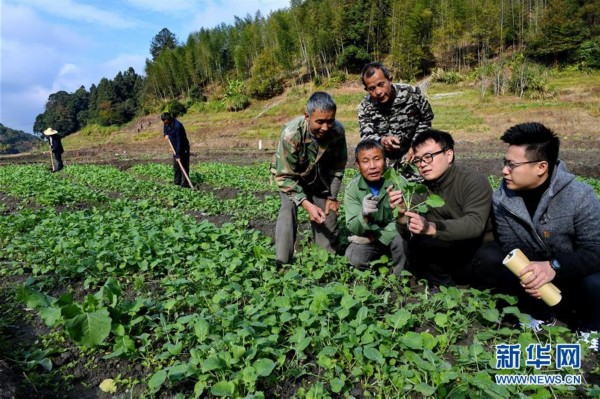 11月23日,福建南平市農(nóng)技員江鑫(右二)與紀(jì)委下派駐村干部陳瑞輝(右一)在延平區(qū)南山鎮(zhèn)前村指導(dǎo)貧困農(nóng)民種植油菜,增加冬季收入。