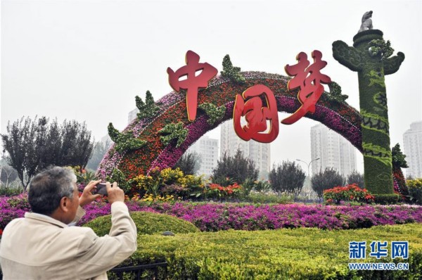 2013年9月30日,一名行人在北京復(fù)興門橋拍攝“中國(guó)夢(mèng)”主題花壇。