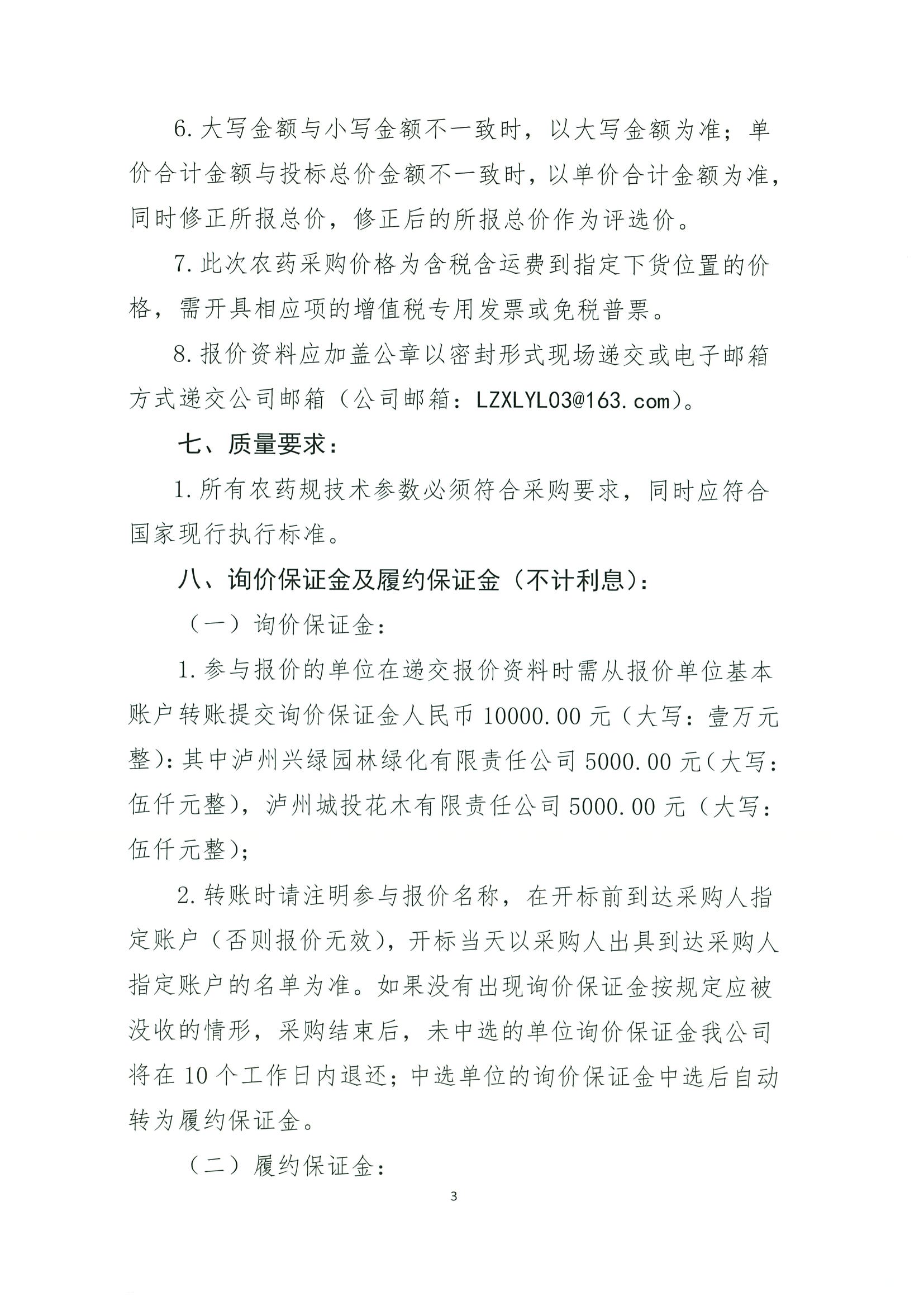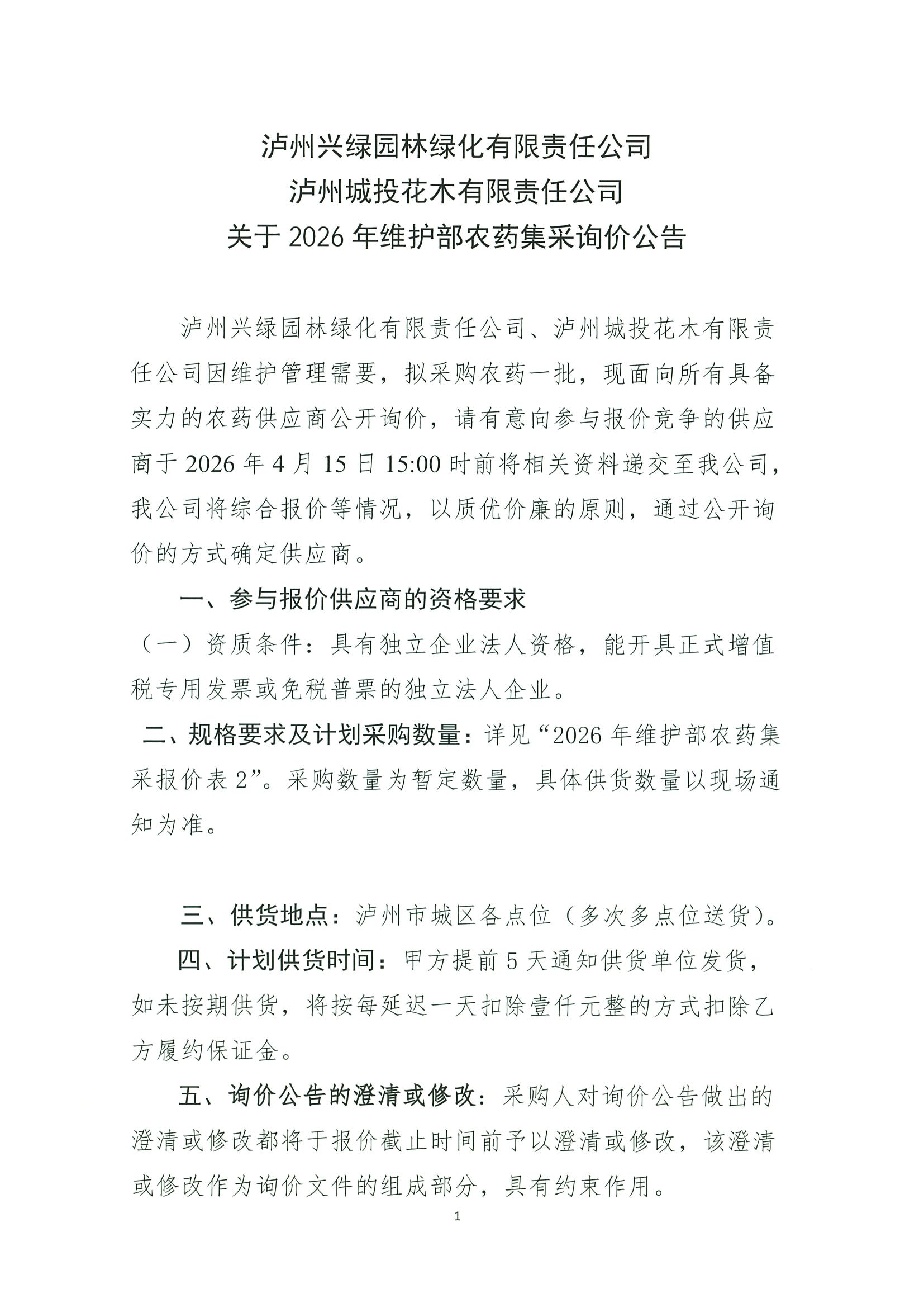 瀘州興綠園林綠化有限責(zé)任公司瀘州城投花木有限責(zé)任公司關(guān)于2026年維護(hù)部農(nóng)藥集采詢價公告